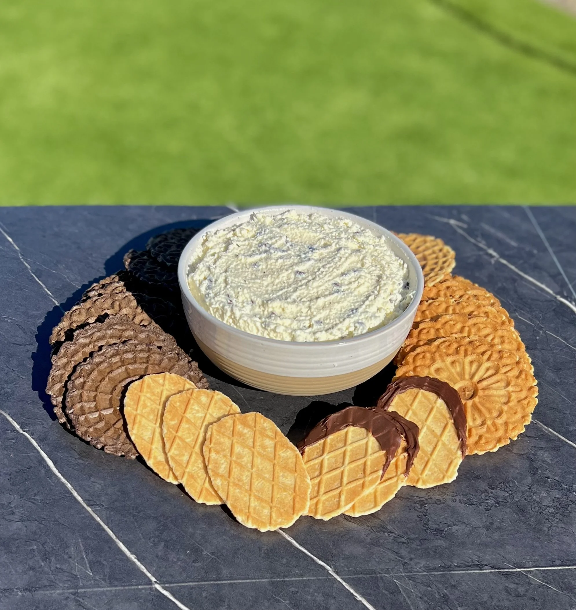 Then serve in a dish and enjoy! Pizzelles and waffle cookies is what I served with but you can get creative with it! Oreos would be good, biscoff cookies, or even fresh fruit like strawberries!