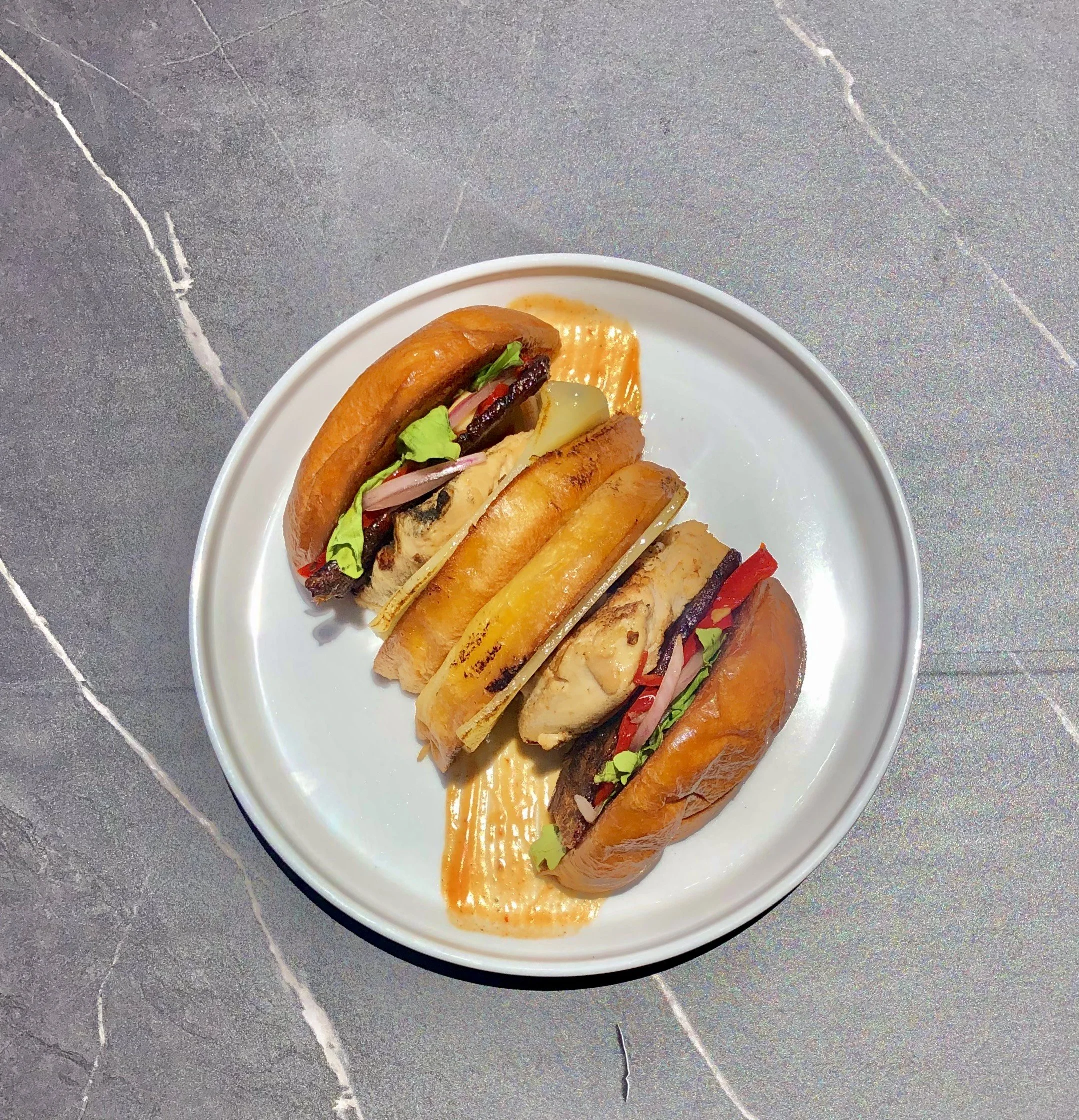In the pictures, I used roasted red peppers, arugula, pickled onions, Monterey jack cheese and a chipotle mustard mayo.